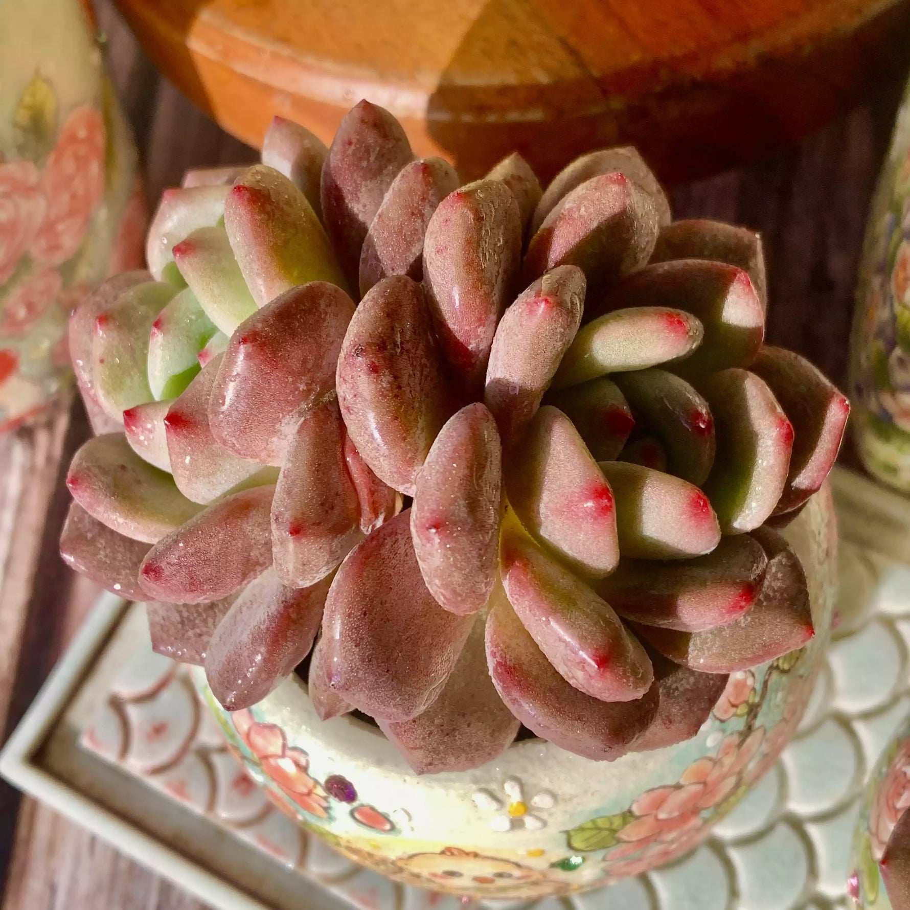 Leaves: Small, spoon-shaped, plump leaves form 4 - 6 cm rosettes. They are pastel green with pinkish-red tips that deepen in sunlight. The leaves are smooth and covered with a powdery bloom.