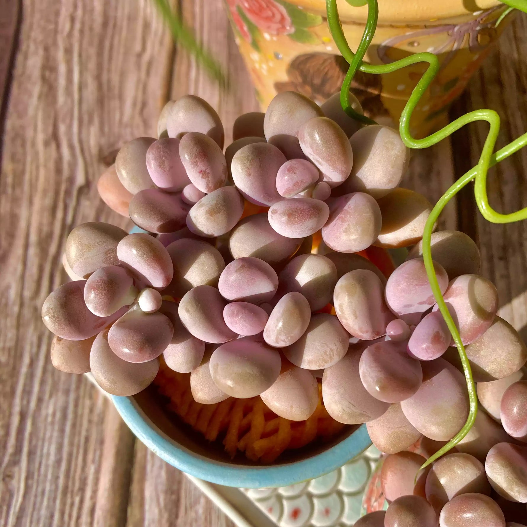 Graptopetalum amethystinum (Rosa) Walther es una suculenta muy apreciada de la familia Crassulaceae. Reconocida por sus hojas regordetas y redondeadas que se asemejan a melocotones maduros, aporta un encanto suave y pastel a cualquier colección de suculentas.