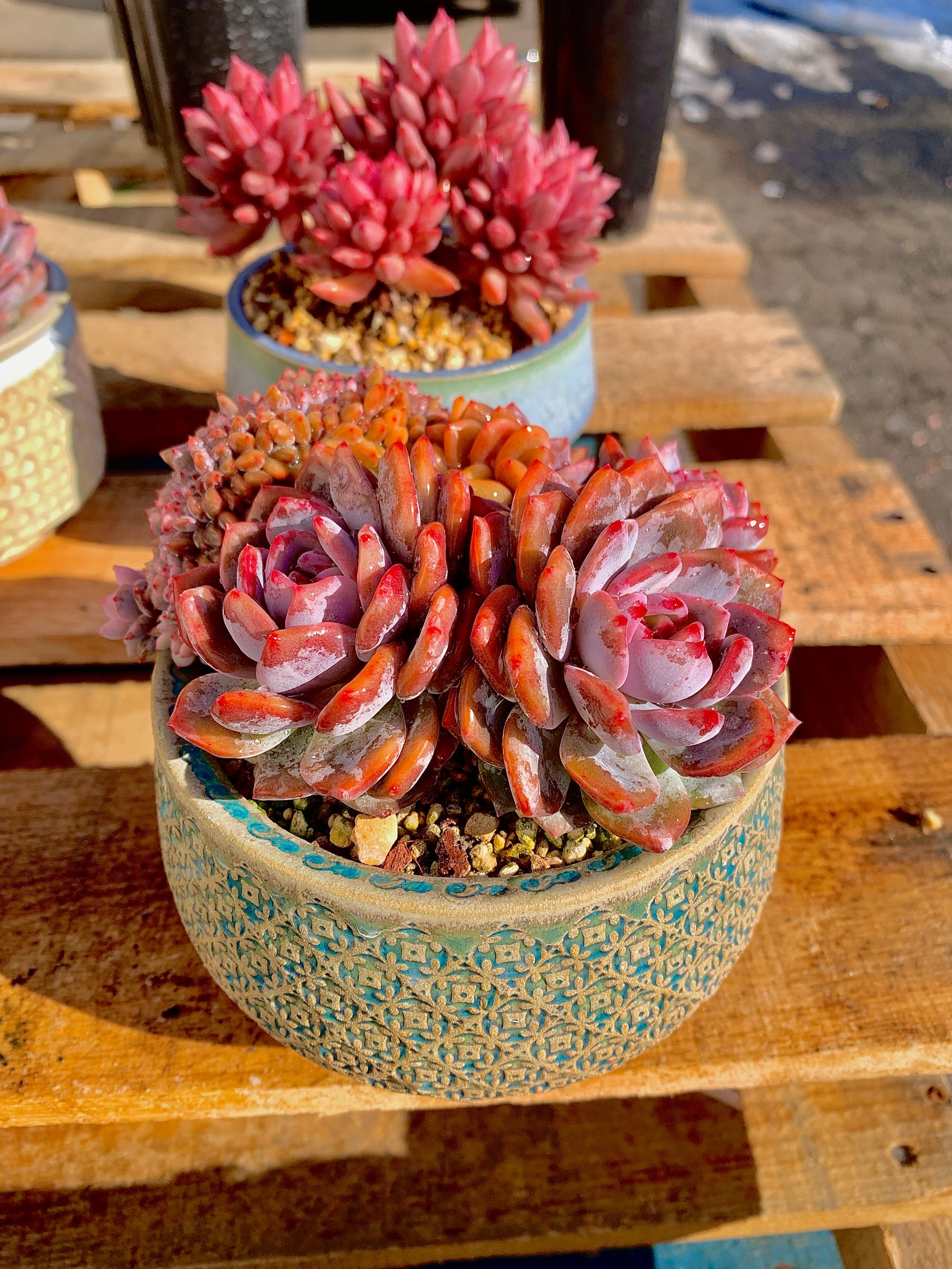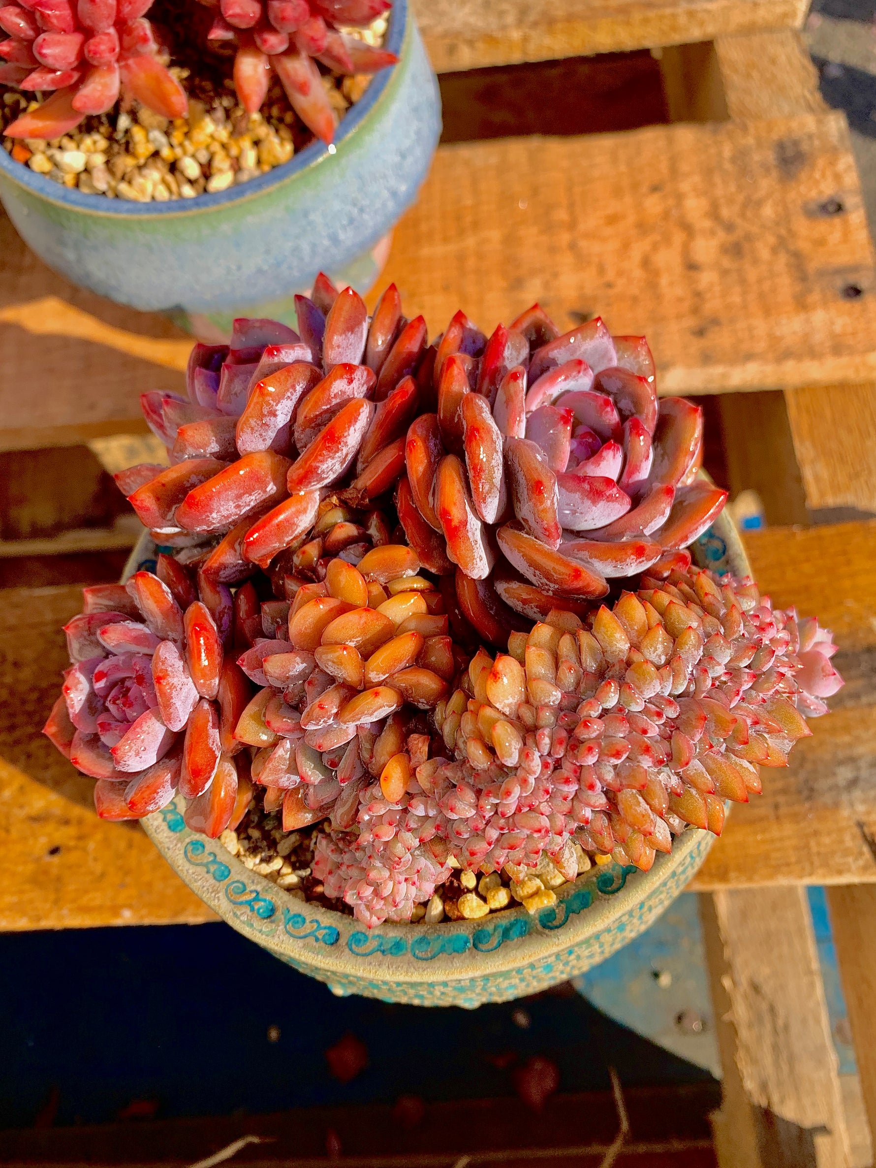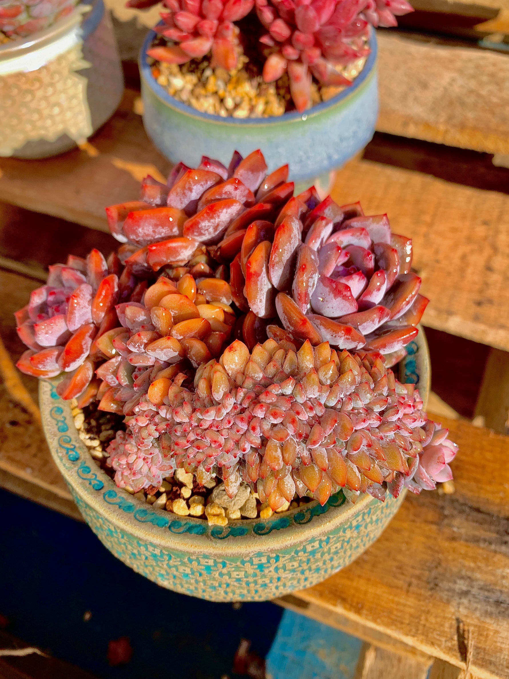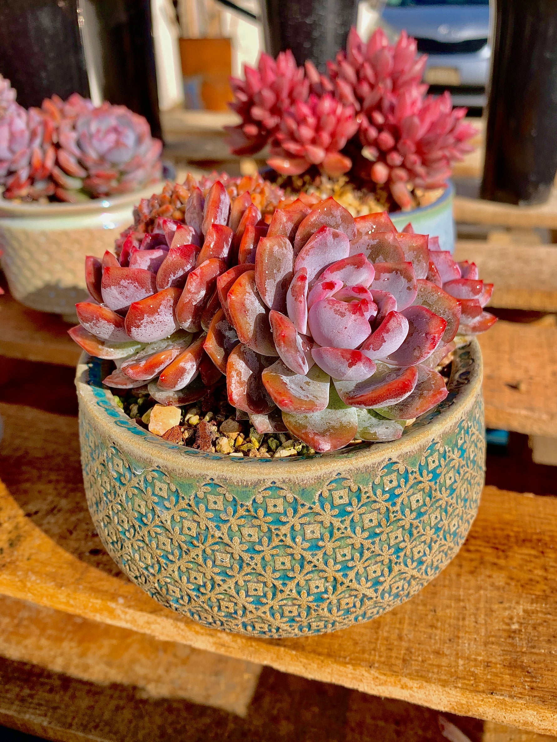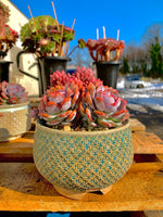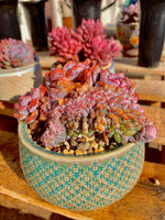 Introducing the Echeveria Orange Monroe Cluster, an alluring succulent plant that will add a pop of color to any space. With its three rosettes showcasing a vibrant pinkish-red color, this plant is sure to catch your eye.