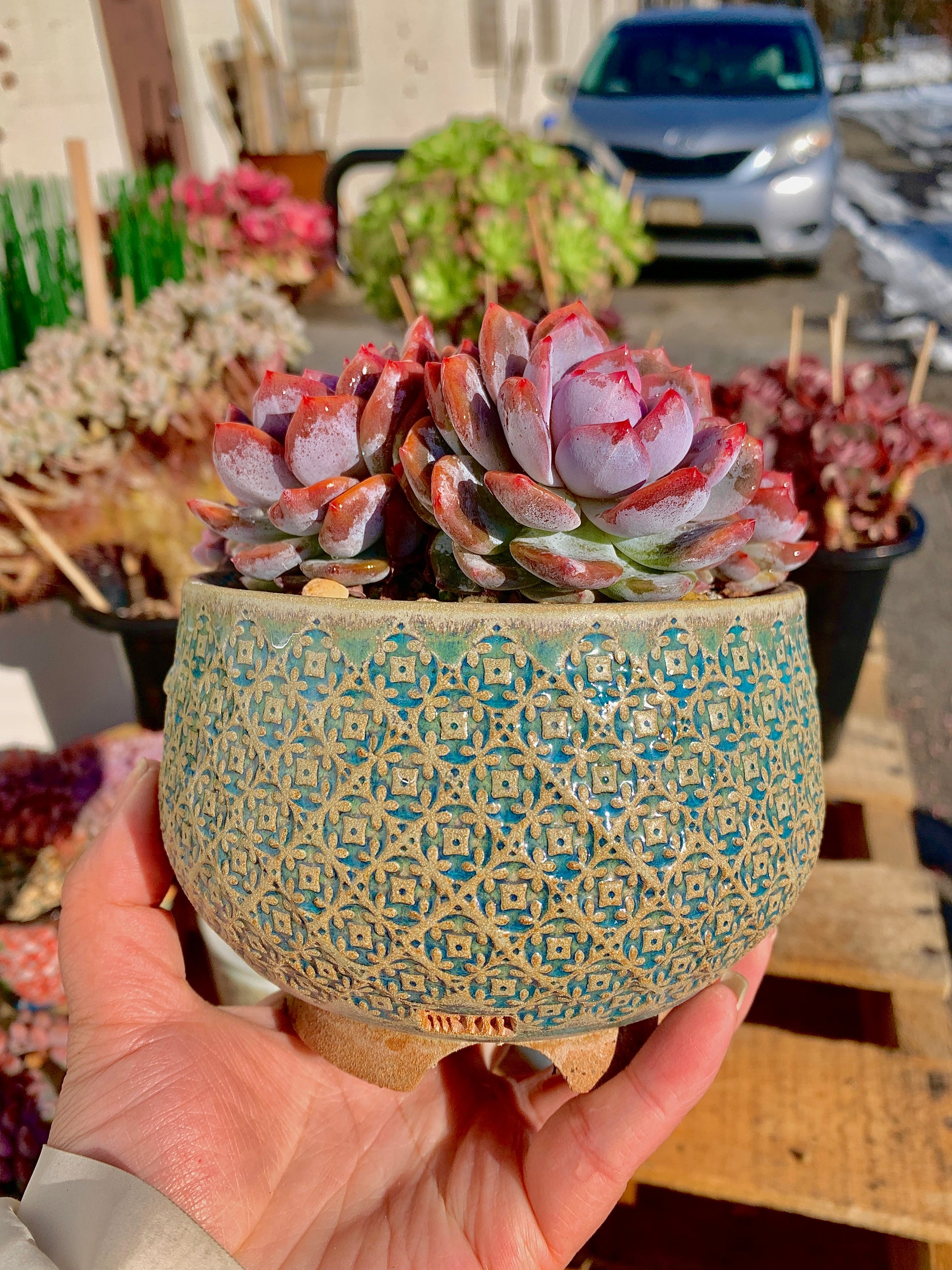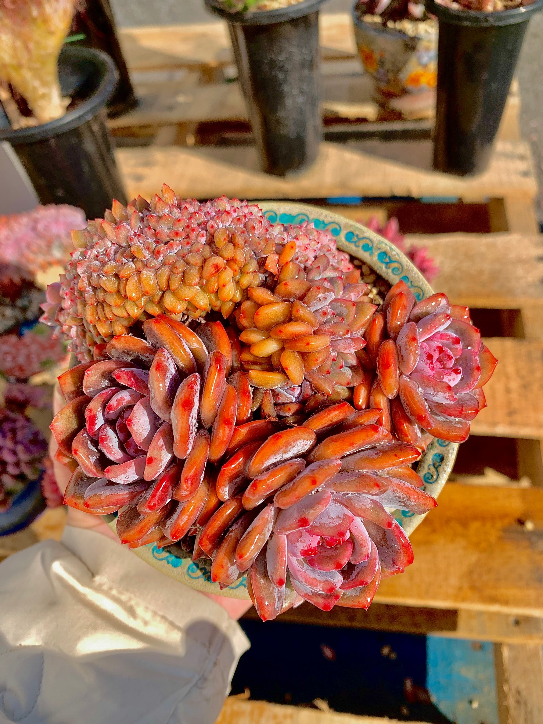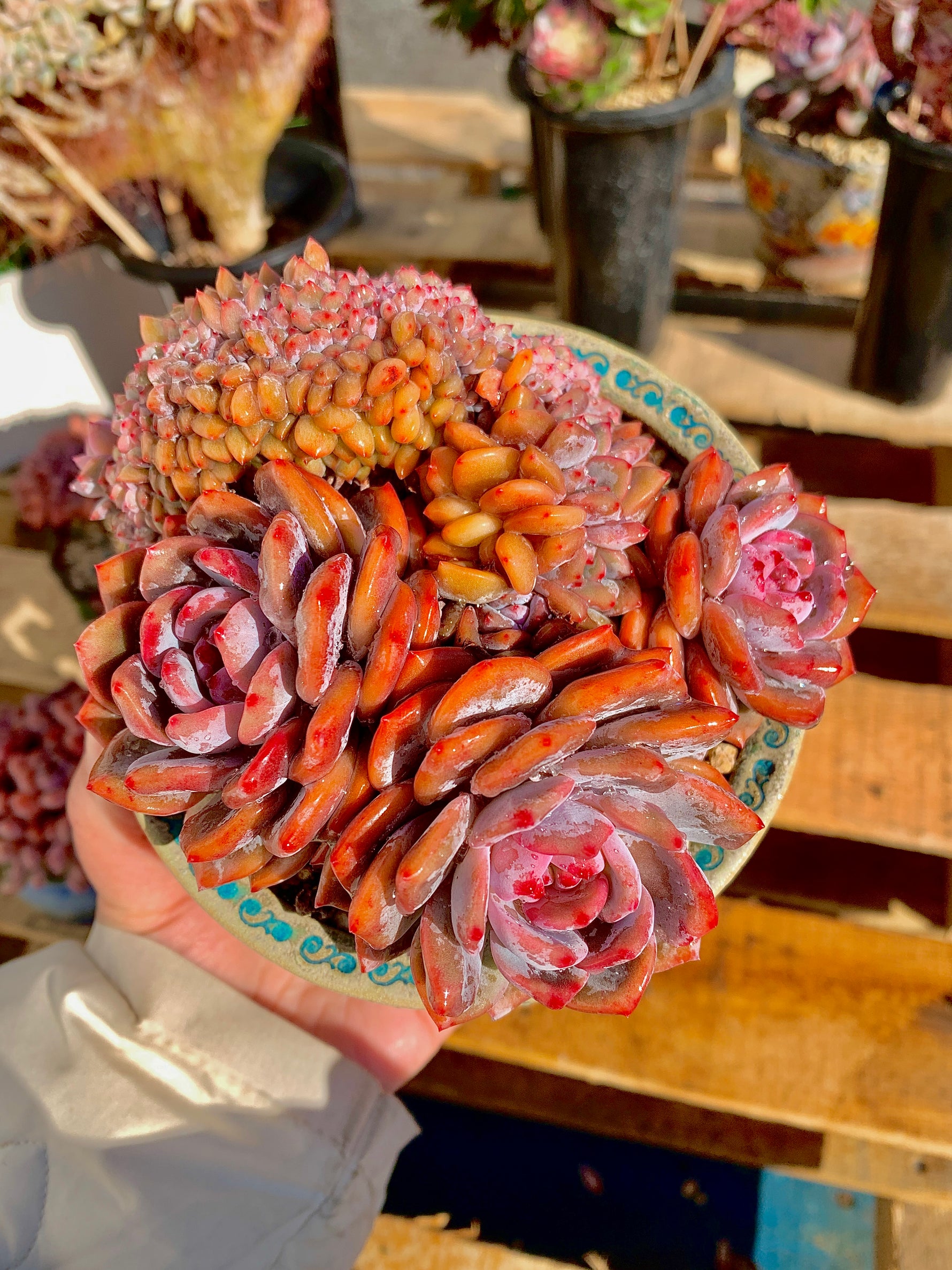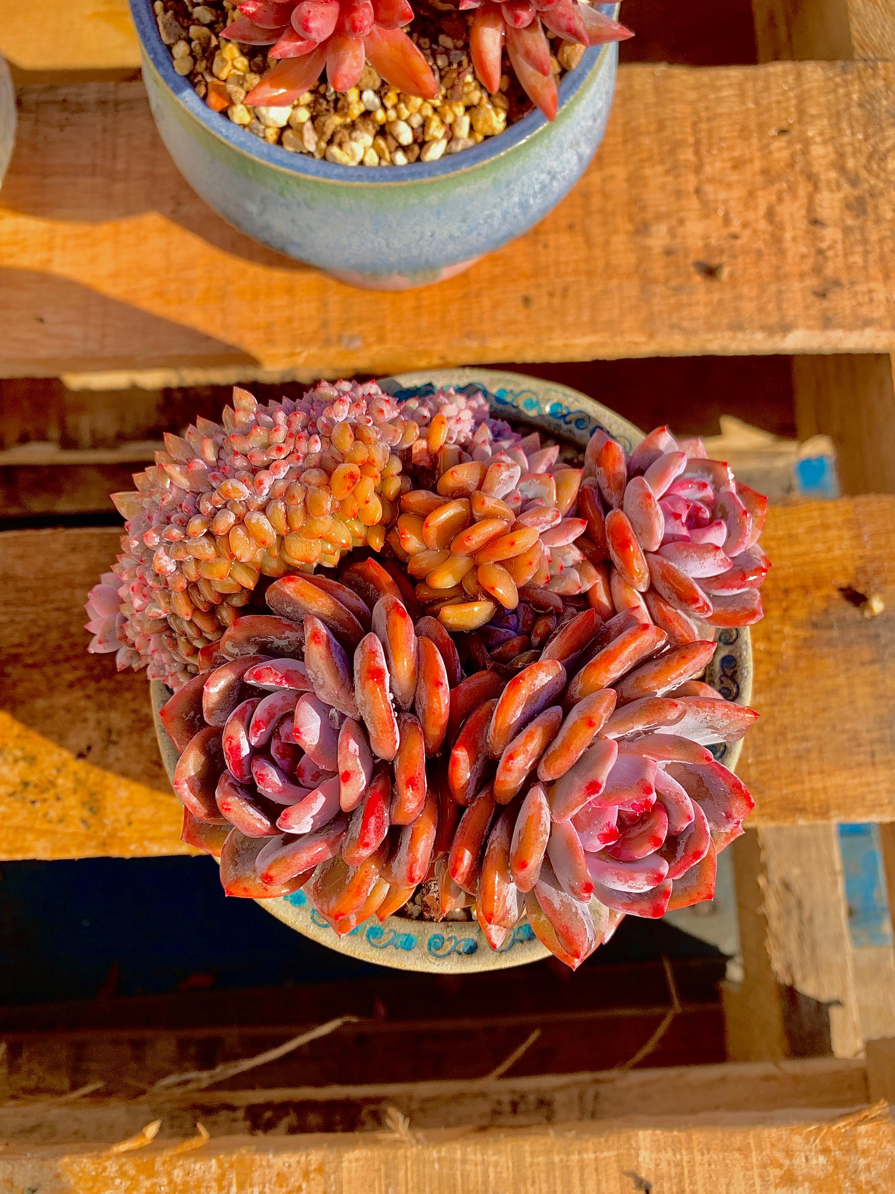 Introducing the Echeveria Orange Monroe Cluster, an alluring succulent plant that will add a pop of color to any space. With its three rosettes showcasing a vibrant pinkish-red color, this plant is sure to catch your eye.