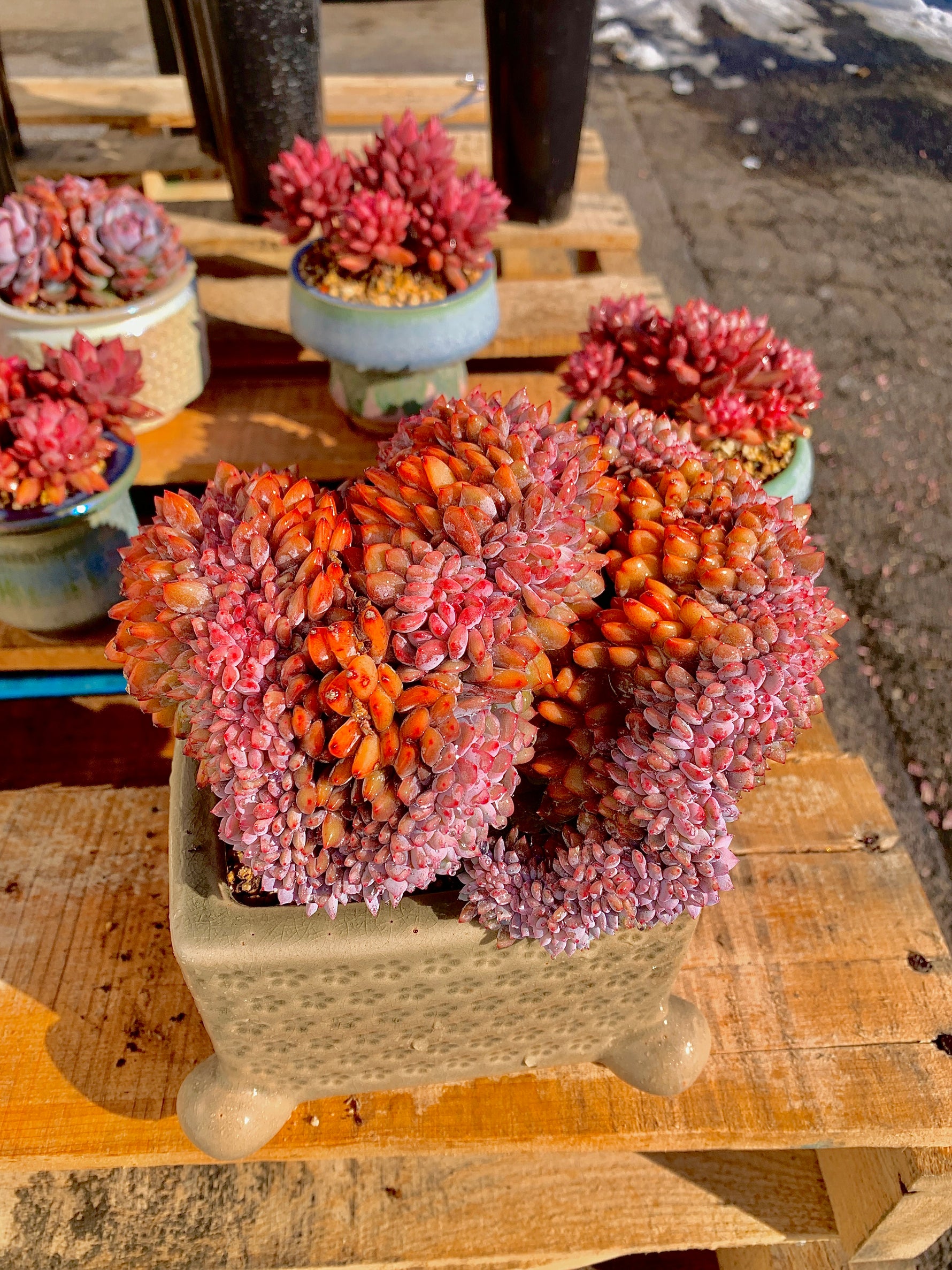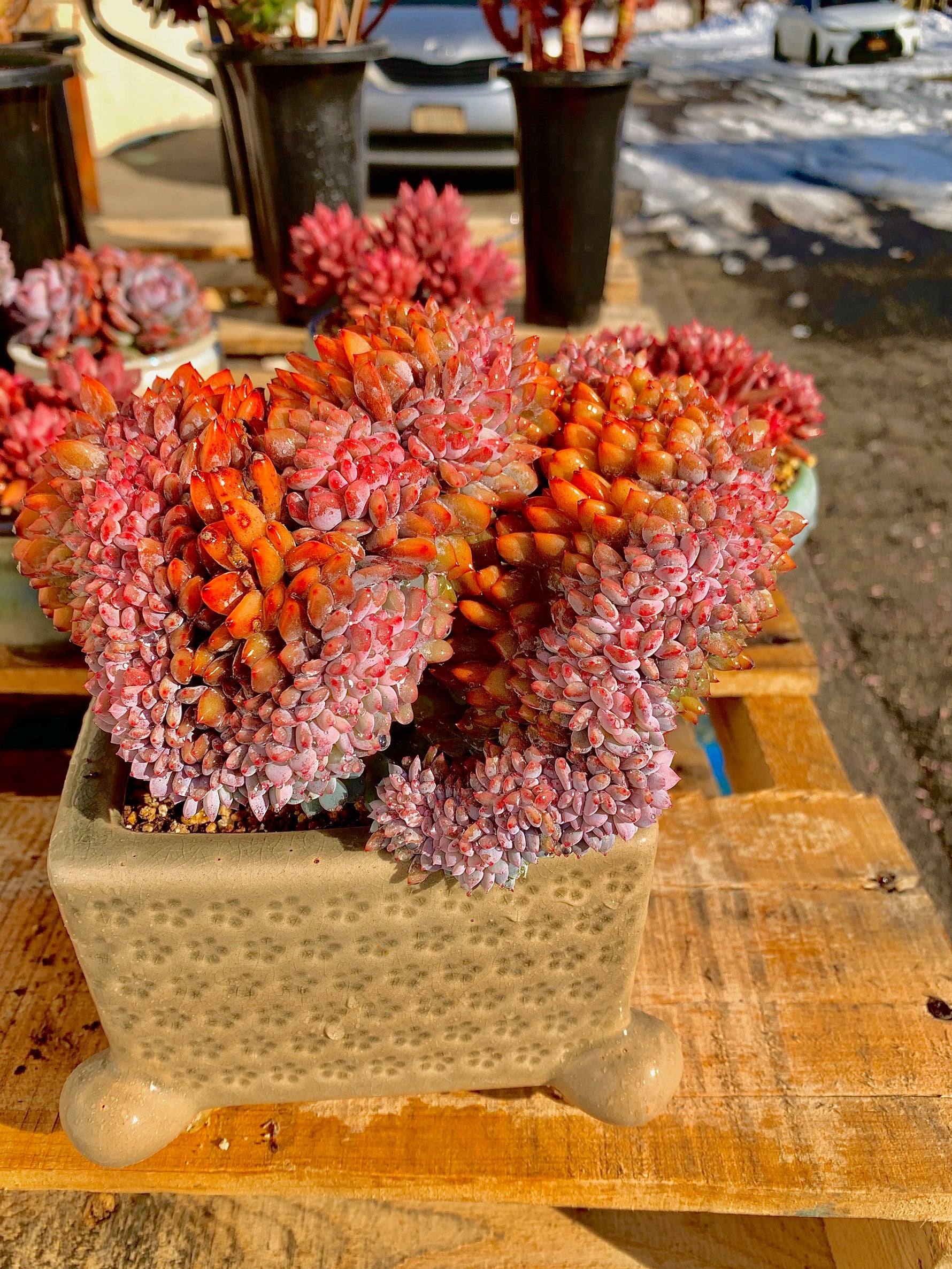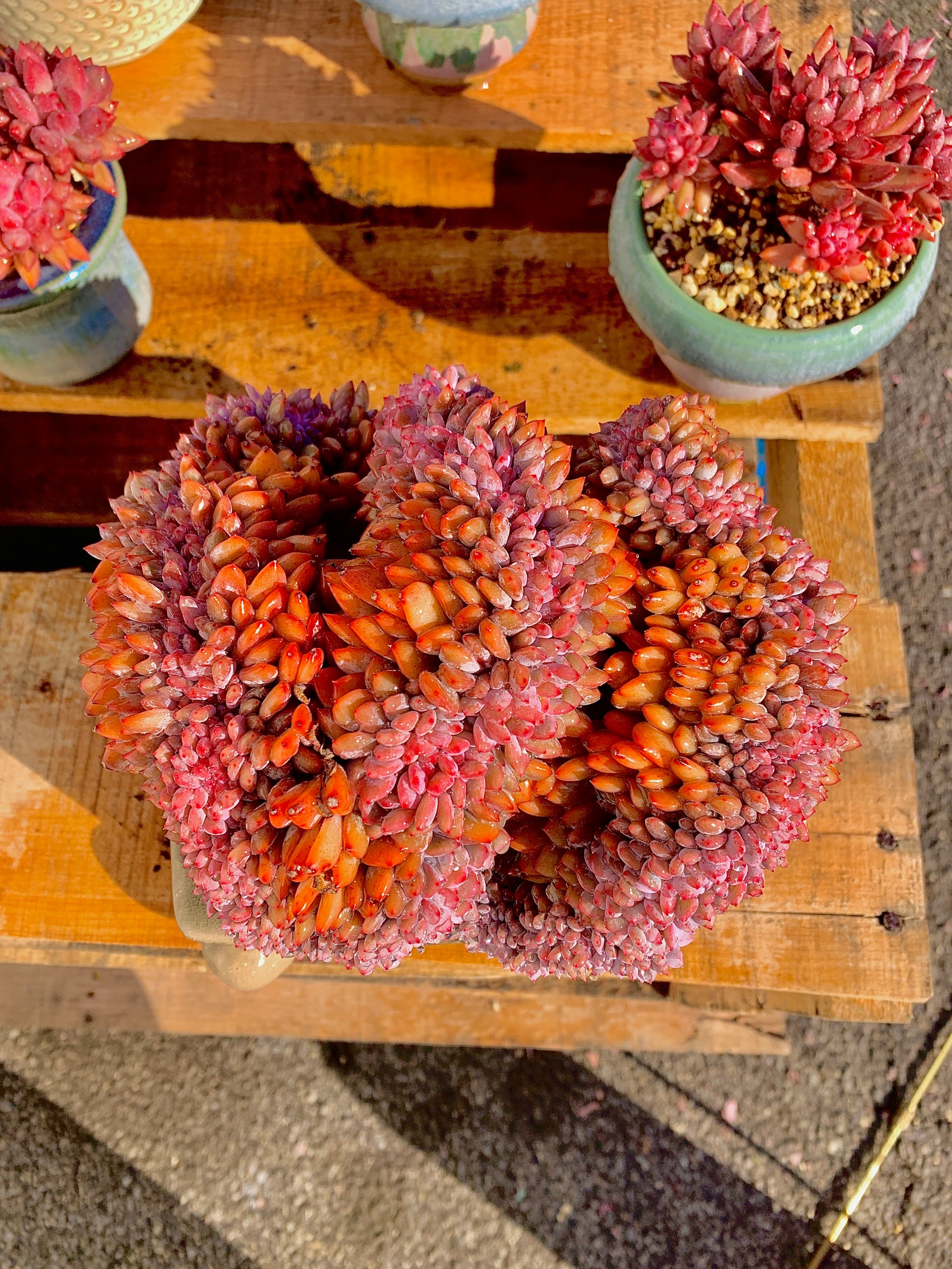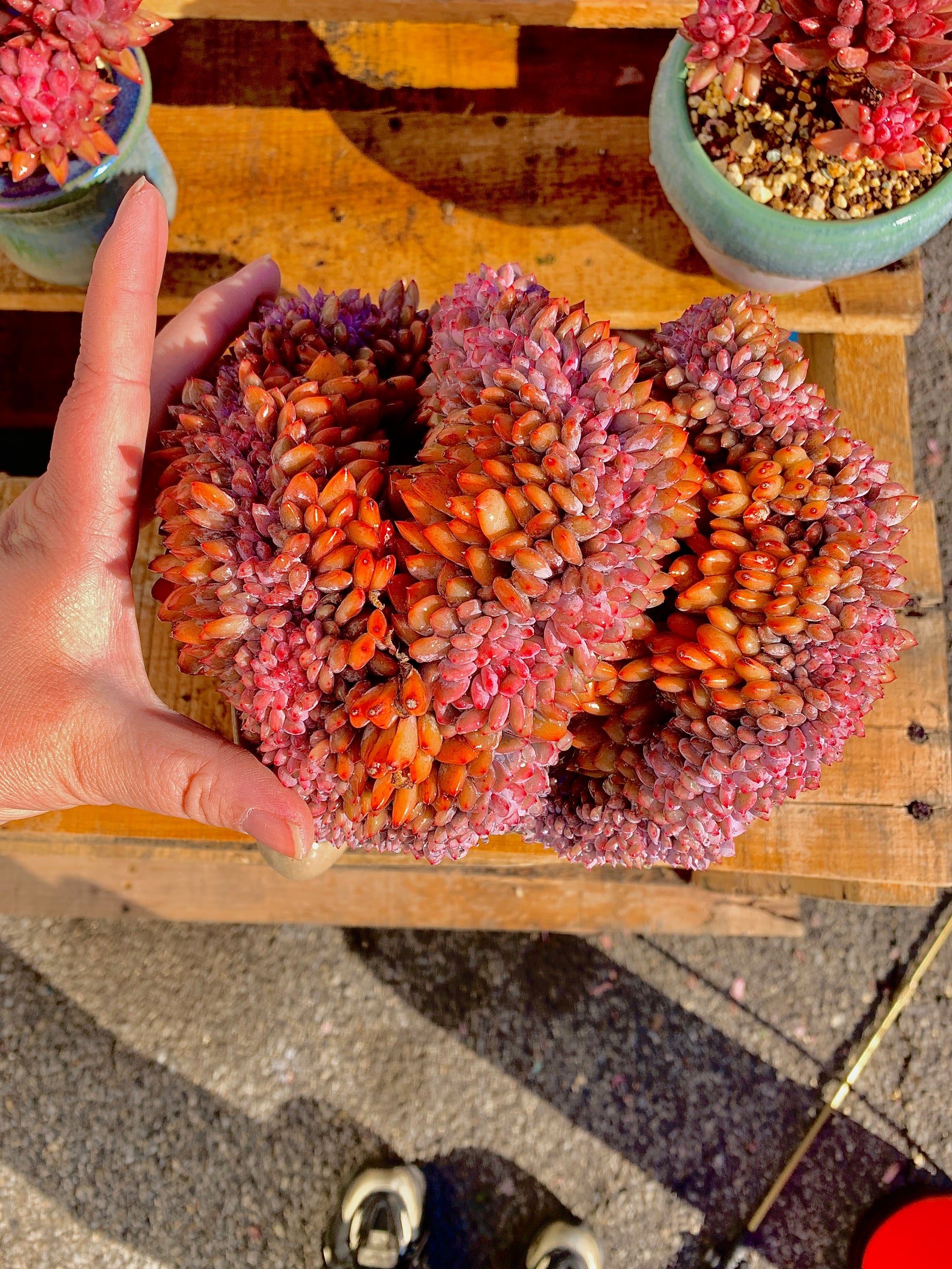 Introducing the Echeveria Orange Monroe Cluster, an alluring succulent plant that will add a pop of color to any space. With its three rosettes showcasing a vibrant pinkish-red color, this plant is sure to catch your eye.