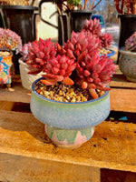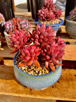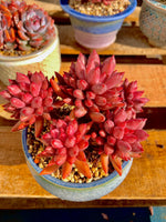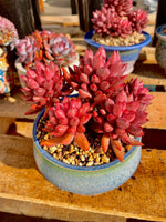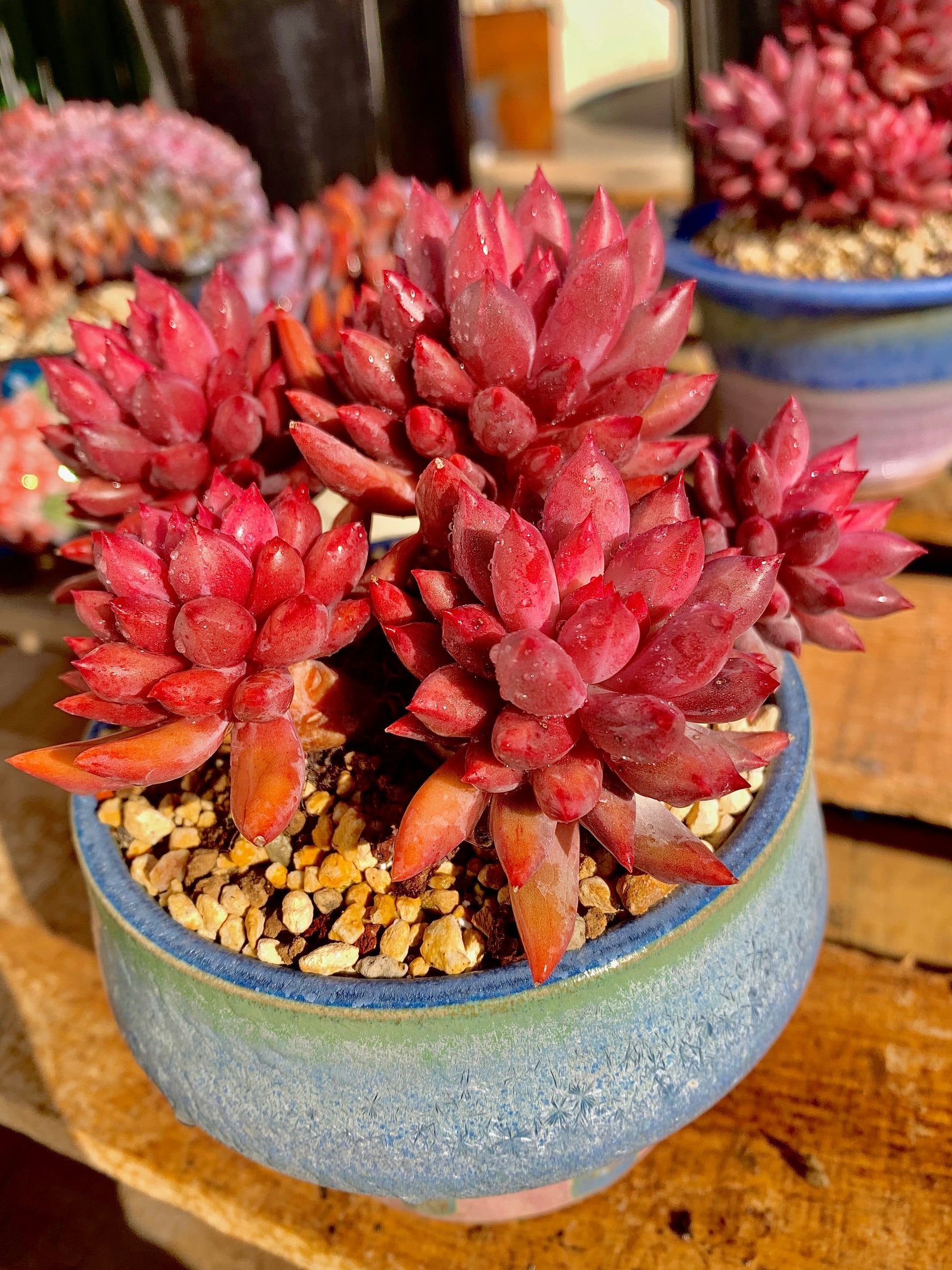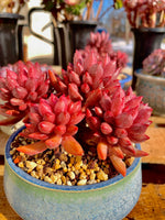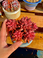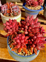 Introducing the breathtaking Echeveria Cherry — a stunning, multi-headed succulent that lives up to its name with rich, deep ruby-red rosettes resembling clusters of ripe cherries. This compact and vibrant variety features tightly packed, pointed leaves that transition from bright red at the tips to soft green near the base, creating a dramatic and eye-catching contrast. This plant forms a full, lush cluster of rosettes on a single stem, making it perfect for both indoor displays and outdoor gardens.
