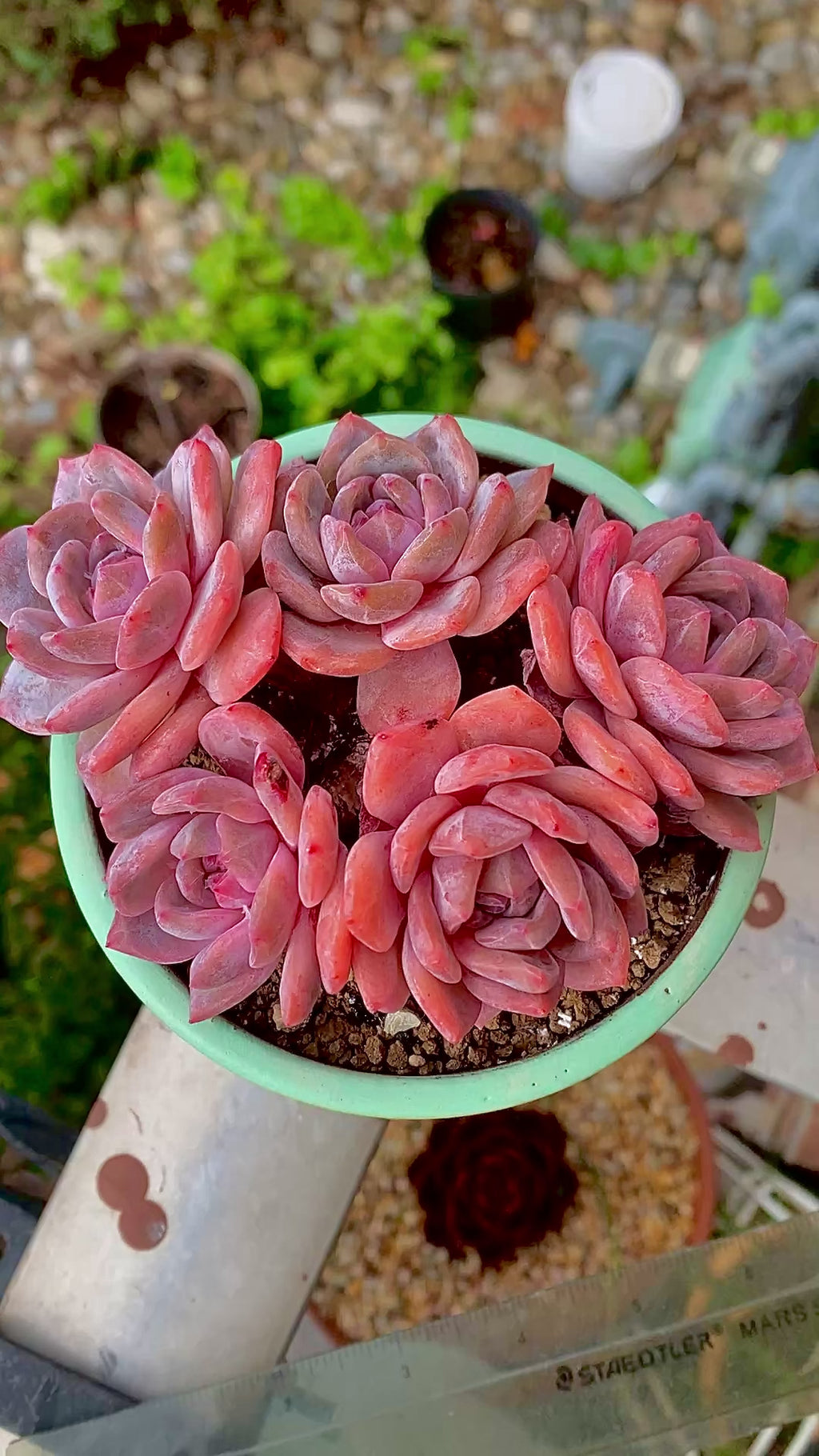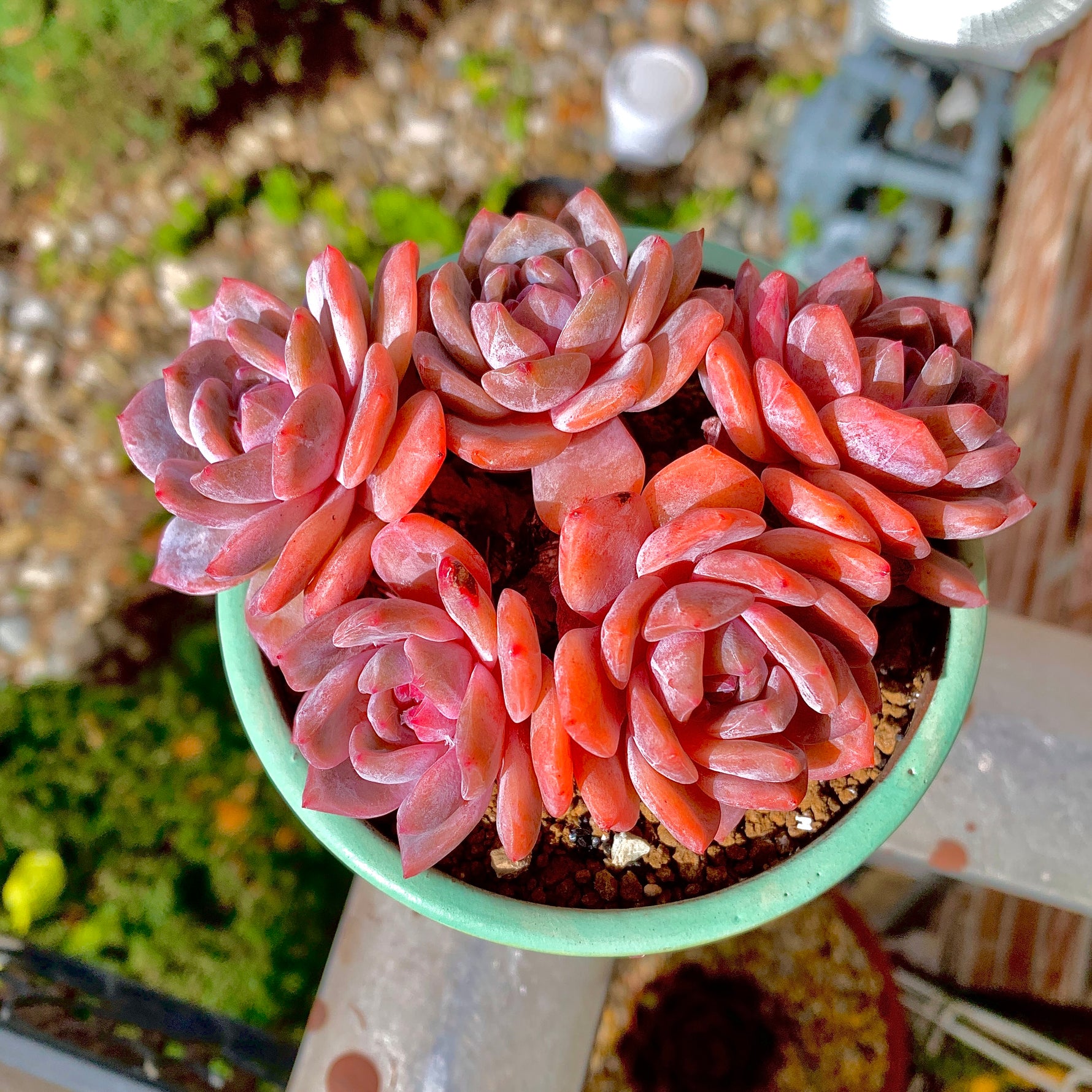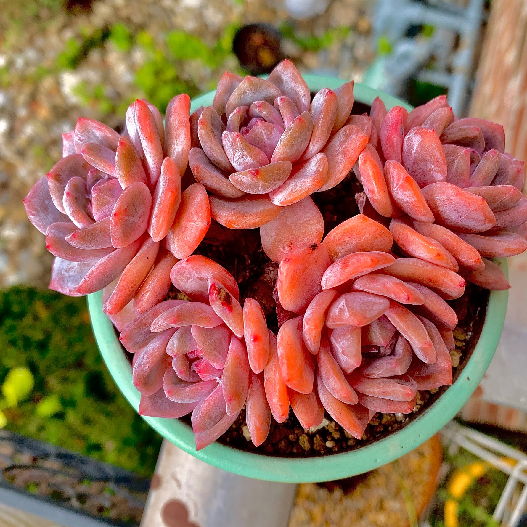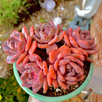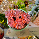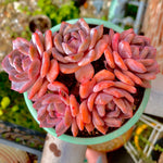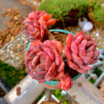 Introducing the Echeveria Orange Monroe 3 Heads, an alluring succulent plant that will add a pop of color to any space. With its three rosettes showcasing a vibrant pinkish-red color, this plant is sure to catch your eye. Measuring approximately 4.5 inches in width, it's perfect for small spaces like desks or shelves.